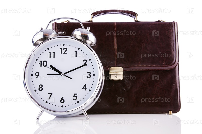 Будильник и портфель, изолированные на белом фоне