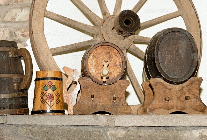 Деревянное колесо от телеги и антикварные деревянные пивные бочонки