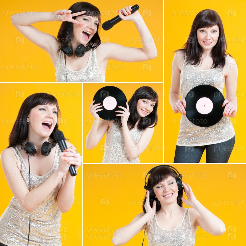 Счастливая молодая женщина поет и слушает музыку, коллаж
