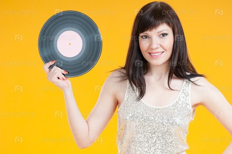 Улыбающаяся девушка держит виниловую пластинку на желтом фоне