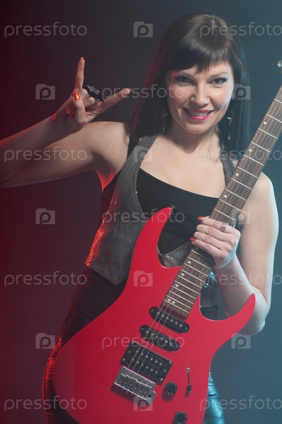 Улыбающаяся женщина-рокер держит электрическую гитару и жестикулирует