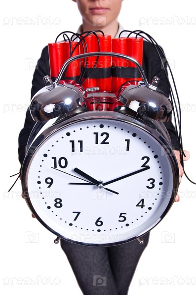 Женщина с динамитом и часами на белом