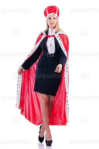Бизнес-леди в королевской мантии, изолированная на белом фоне