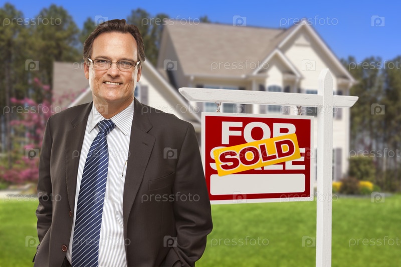 Агент по недвижимости на фоне дома и знака и продаже