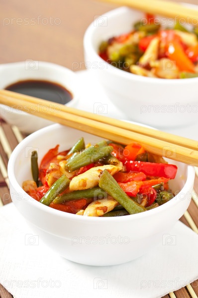 Жареный цыпленок с сладким перцем и зеленой фасолью