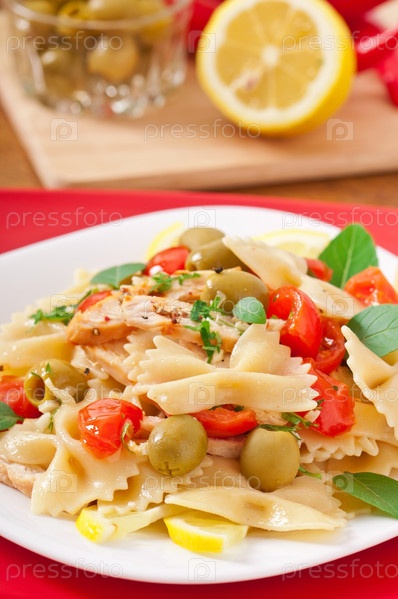 Испанский салат с макаронами в форме бантиков, помидораями и курицей