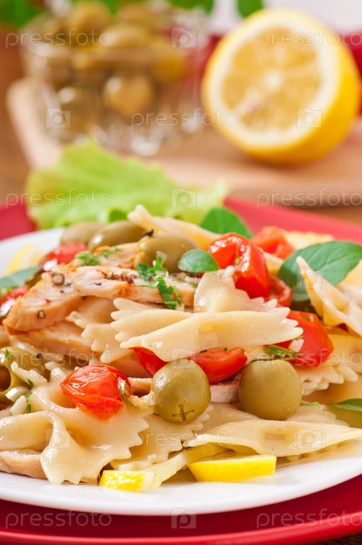 Испанский салат с макаронами в форме бантиков, помидораями и курицей