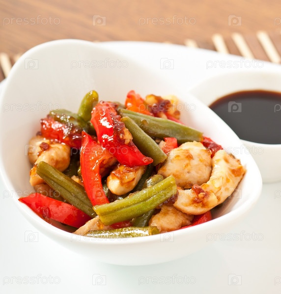 Жареный цыпленок со сладким перцем и зеленой фасолью