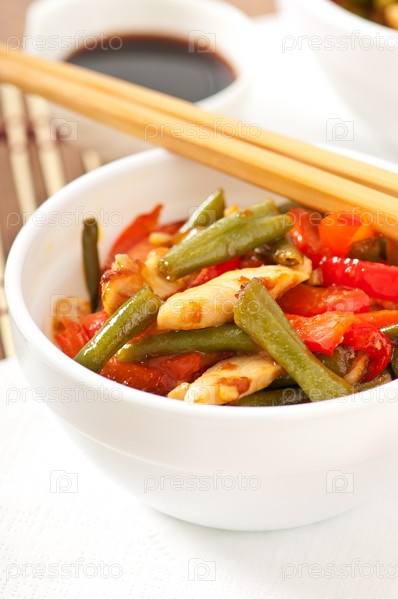 Жареный цыпленок со сладким перцем и зеленой фасолью