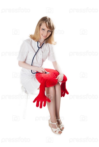 Врач слушает игрушечное сердце фонендоскопом
