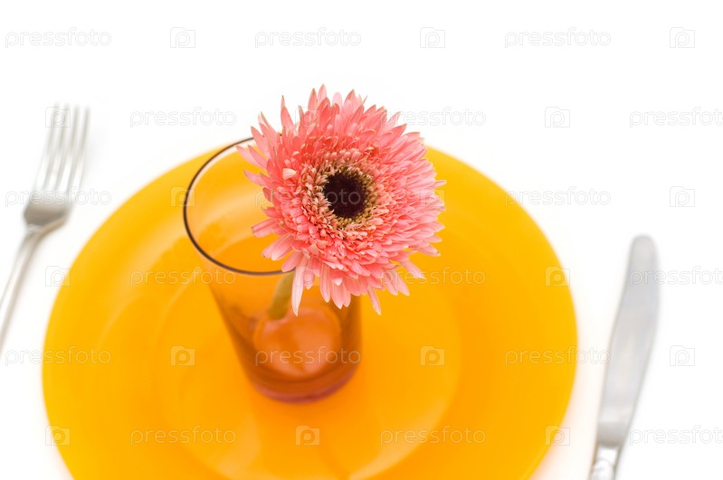 Розовая гербера в стакане, стоящем на желтой тарелке, изолированная на белом фоне