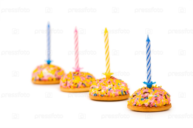 Пирожные со свечами на белом фоне