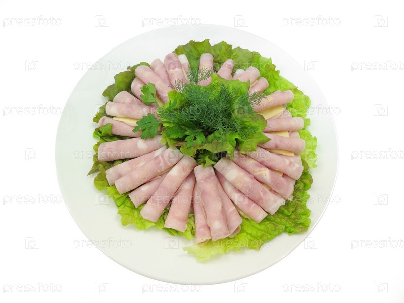 Кусочки ветчины с сыром на листьях салата