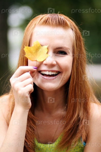 Смеющаяся девушка с осенним листом
