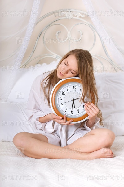 Молодая красивая женщина в постели с будильником