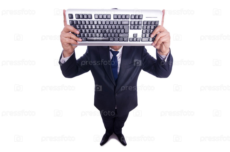 Ботаник-бизнесмен с компьютерной клавиатурой на белом фоне