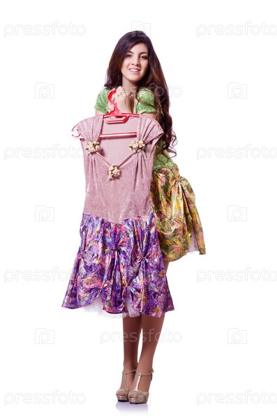 Женщина пытается выбрать платье на белом фоне