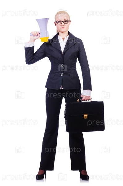 Бизнес-леди с громкоговорителем на белом