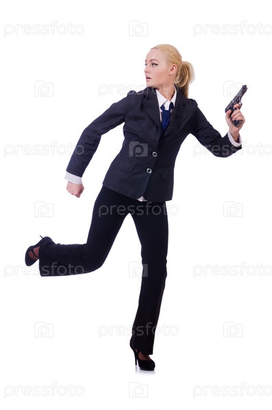 Женщина с пистолетом, изолированная на белом