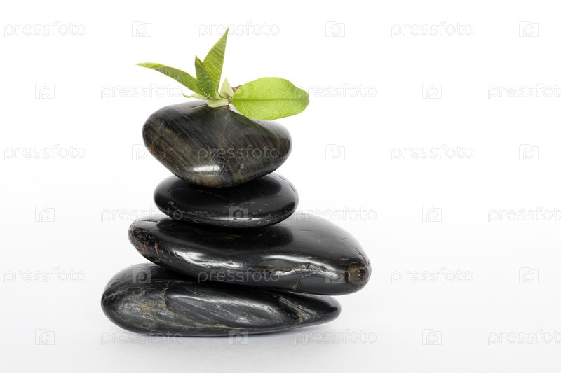 Зеленые листья на черных камнях, белый фон