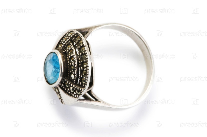 Серебряное кольцо с голубым камнем на белом фоне