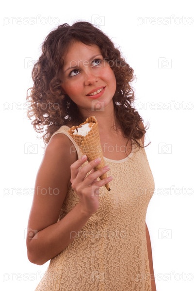 Молодая женщина ест мороженое, изолированная на белом фоне