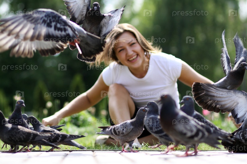 Красивая молодая женщина и голуби
