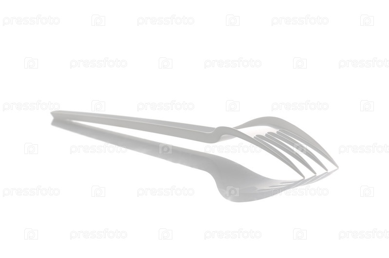 Пластиковая вилка, отражающаяся на белой поверхности