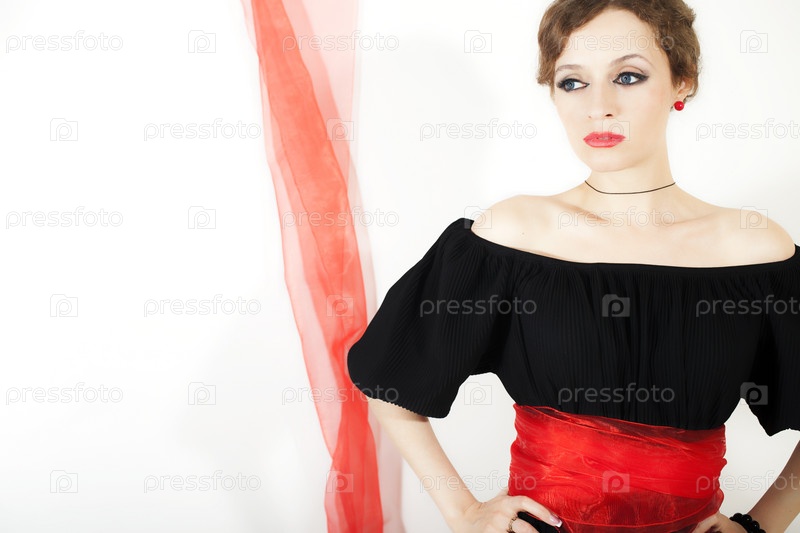 Женщина в черном платье с красным поясом на белом фоне