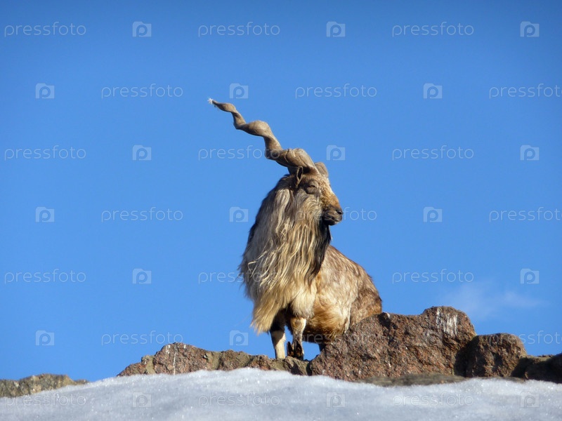 Горный козел на скале на фоне голубого неба