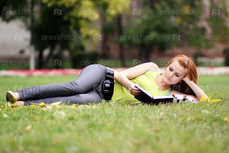 Девушка читает книгу на траве