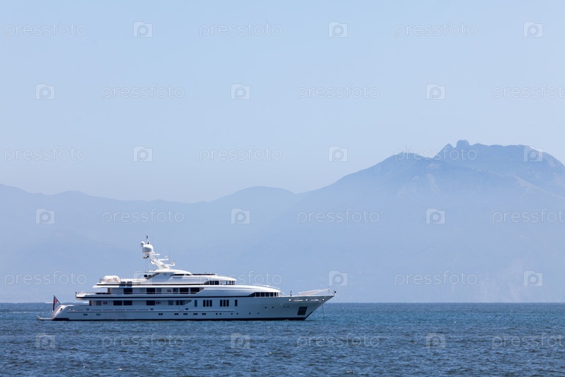 Большая белая яхта в море на фоне гор