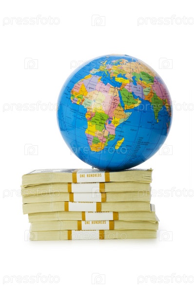 Стопка денег и глобус на белом фоне