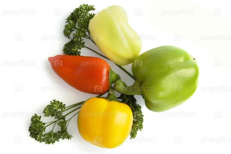 Четыре сладких перца красного, зеленого, желтого и бледно-желтого цвета с веточками петрушки