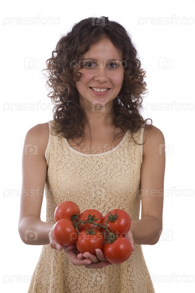 Девушка с помидорами в руках, белый фон