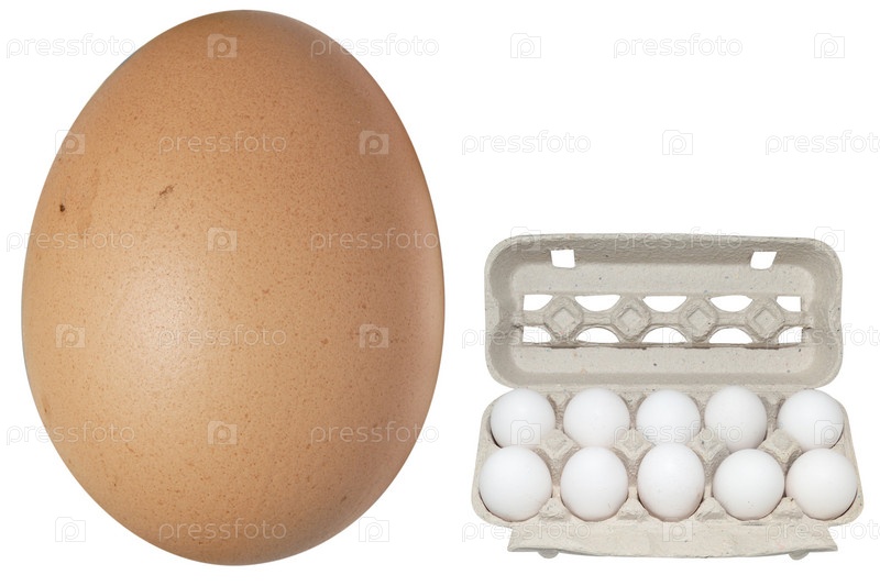 Коричневое куриное яйцо крупным планом и грохотка белых яиц, изолированные на белом фоне