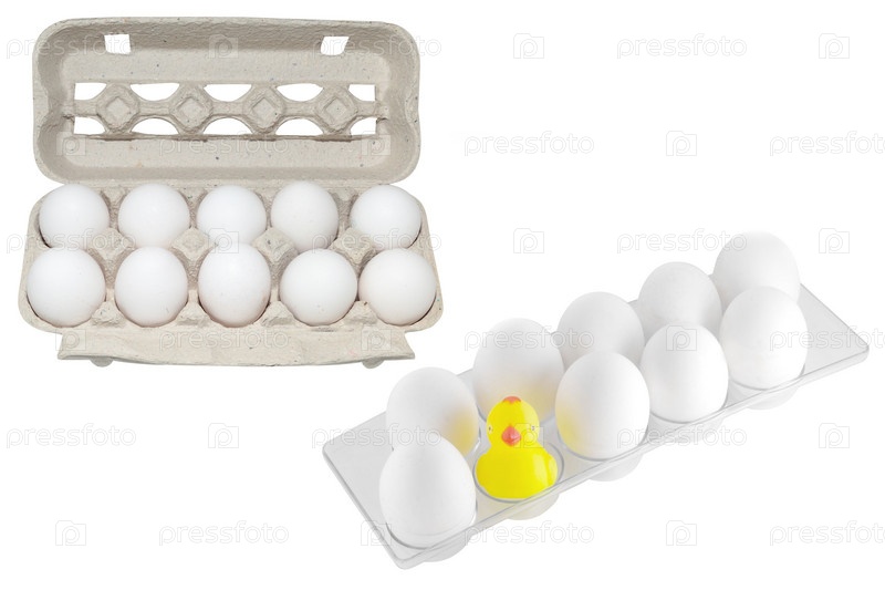 Яйца в упаковках, изолированные на белом фоне