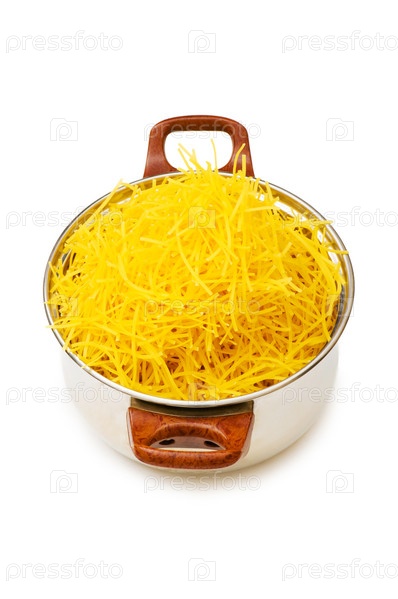 Кастрюля со спагетти на белом фоне