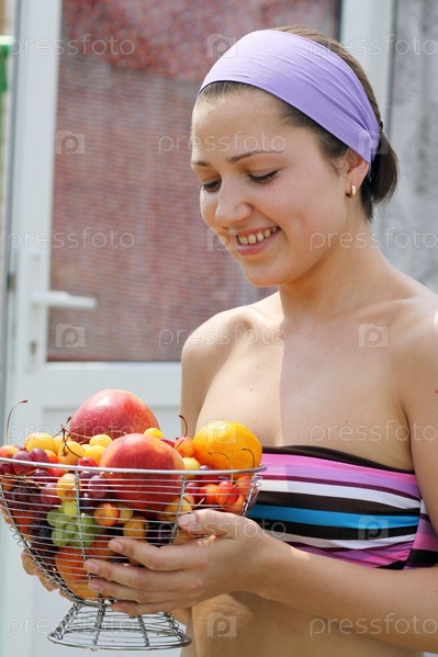 Молодая женщина с вазой фруктов