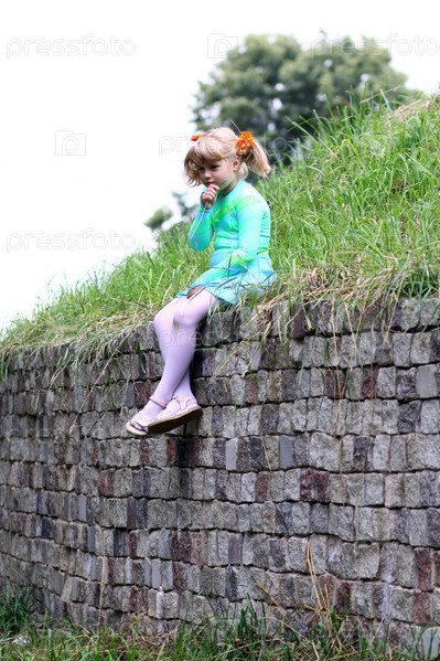 Маленькая девочка сидит на каменной стене в парке