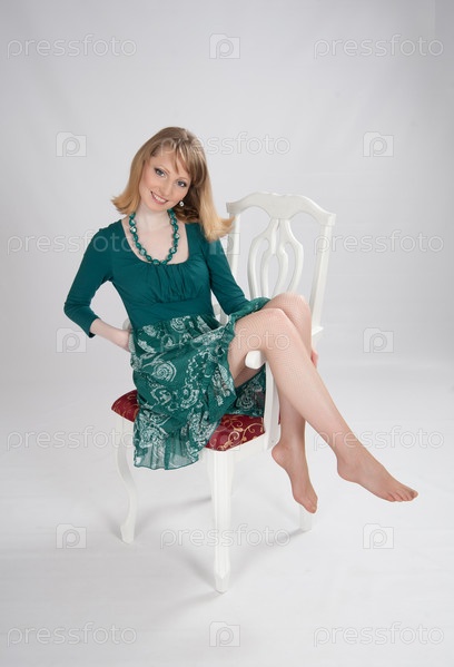 Женщина в зеленом платье сидит на стуле