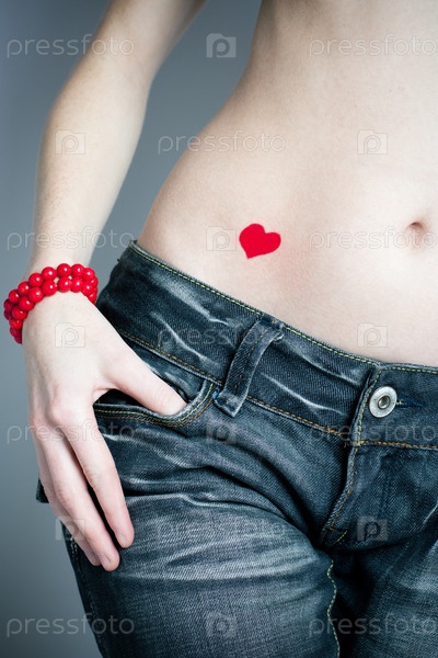 Девушка в джинсах с красным сердечком на животе
