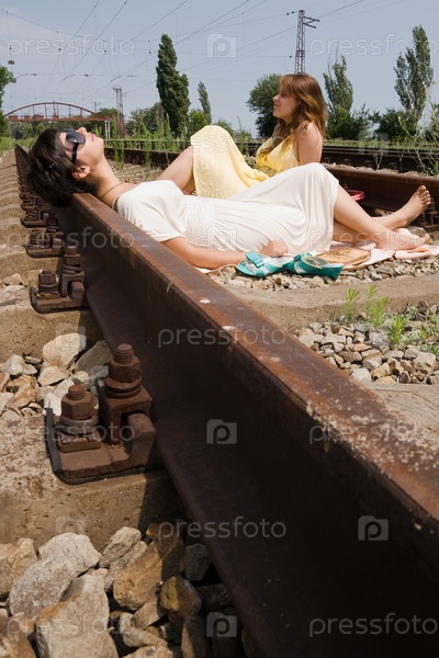 Молодые девушки лежат на железнодорожном полотне летним днем