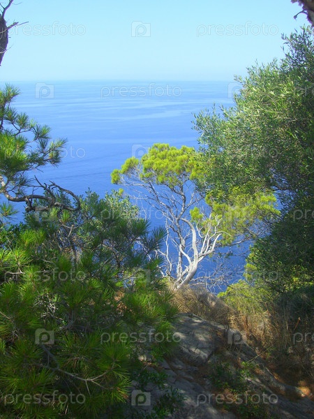 Вид на море сквозь ажурные сосновые ветви, Мальорка, Испания