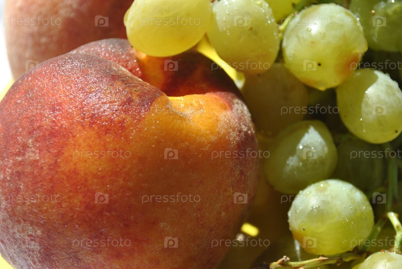 Гроздь винограда с персиком крупным планом