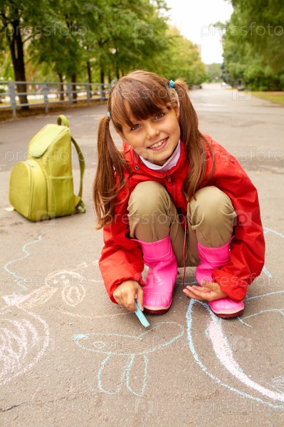 Девочка-школьница рисует мелом на асфальте
