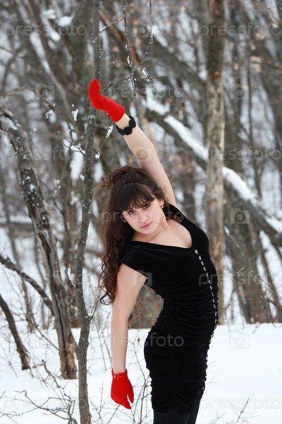 Девушка в красных перчатках с поднятой рукой стоит в лесу
