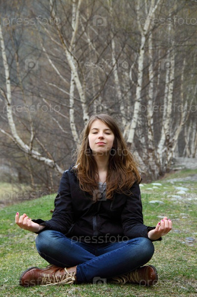 Красивая девушка медитирует, сидя на траве