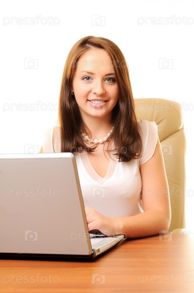 Молодая красивая девушка с ноутбуком на белом фоне