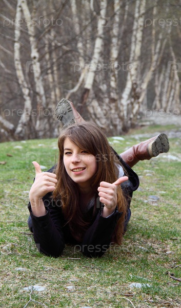 Красивая девушка показывает большие пальцы, лежа на траве